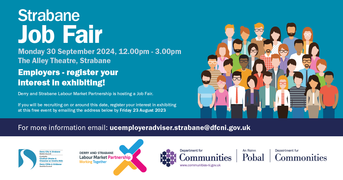 Strabane Job fair will be held on Monday 30th September 2024 in the Alley Theatre, Strabane – please see attached, Call for Employer and Employer Registration of Interest form.
